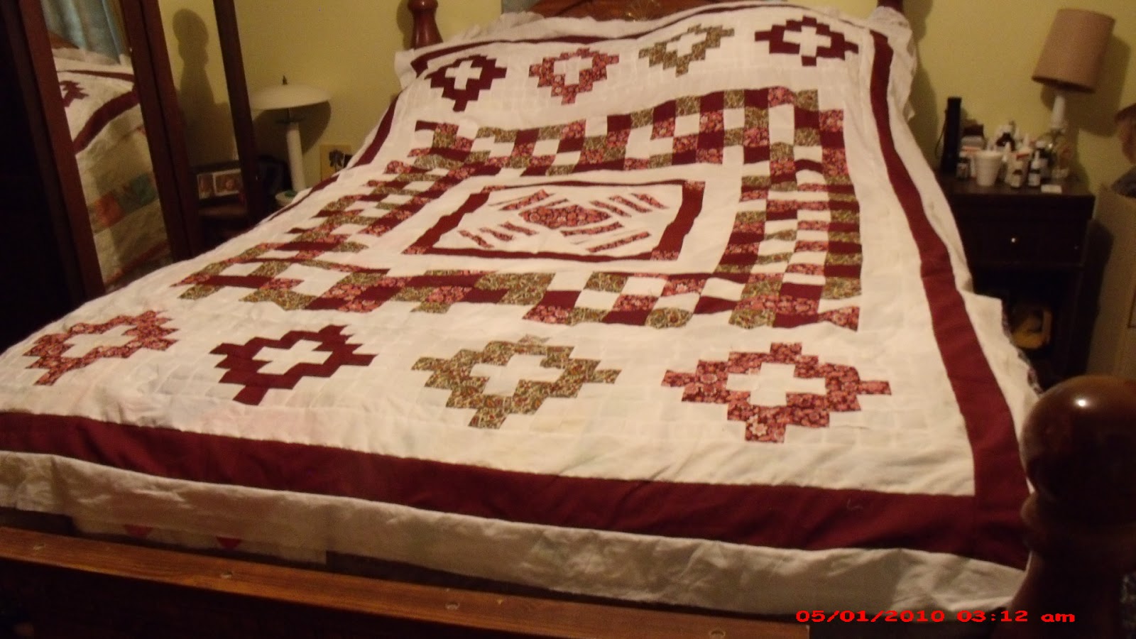 I added the rest of the burgundy solid strips , this part will cover a queen sized bed.